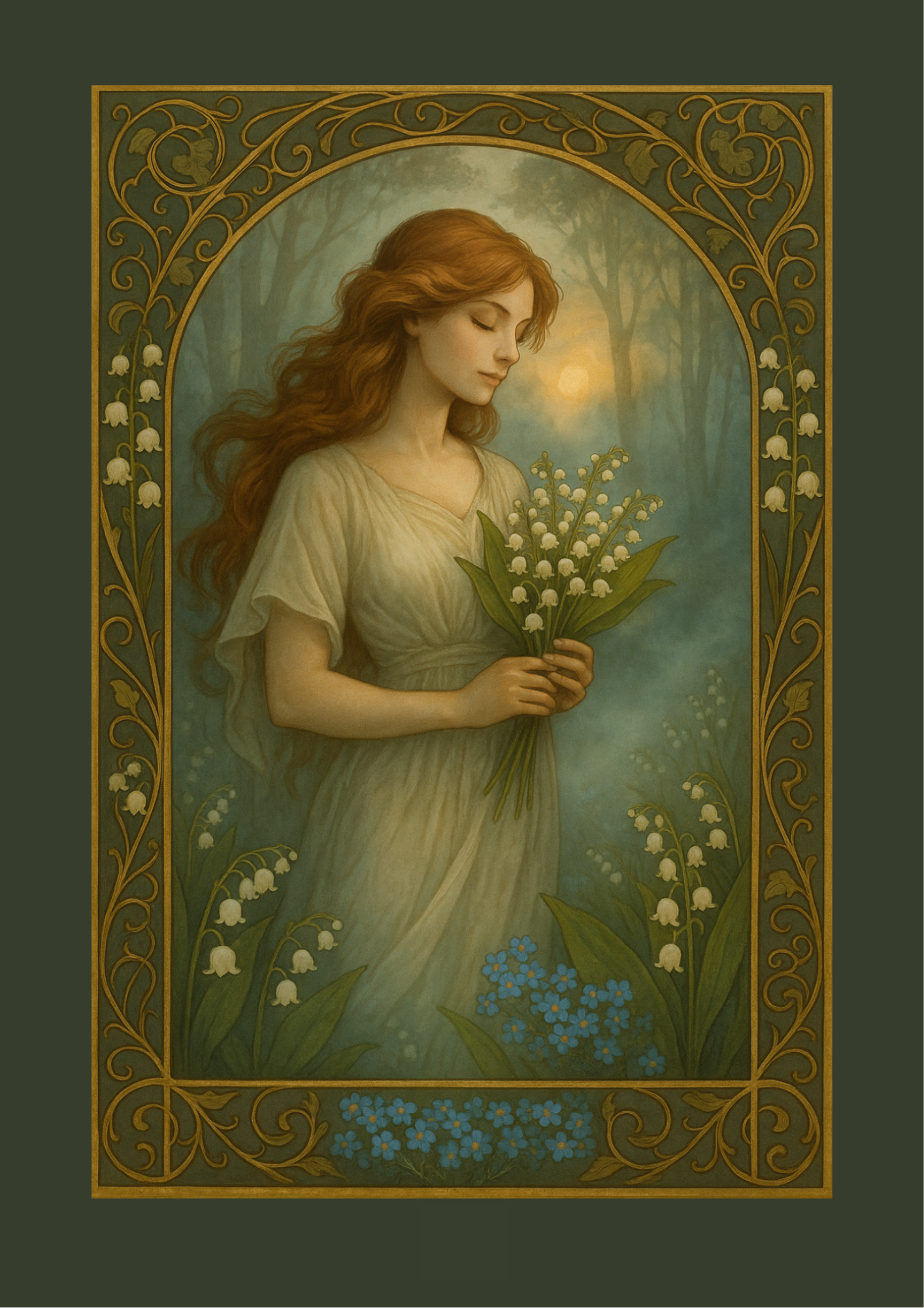 Denna stämningsfulla Art Nouveau-inspirerade affisch fångar en tidlös stund i skogens gryning. En kvinna klädd i ljust linne håller en bukett liljekonvalj i händerna, omgiven av dimma, vitsippor och förgätmigej. Solen stiger bakom henne i ett stilla ljus som smyger mellan träden.